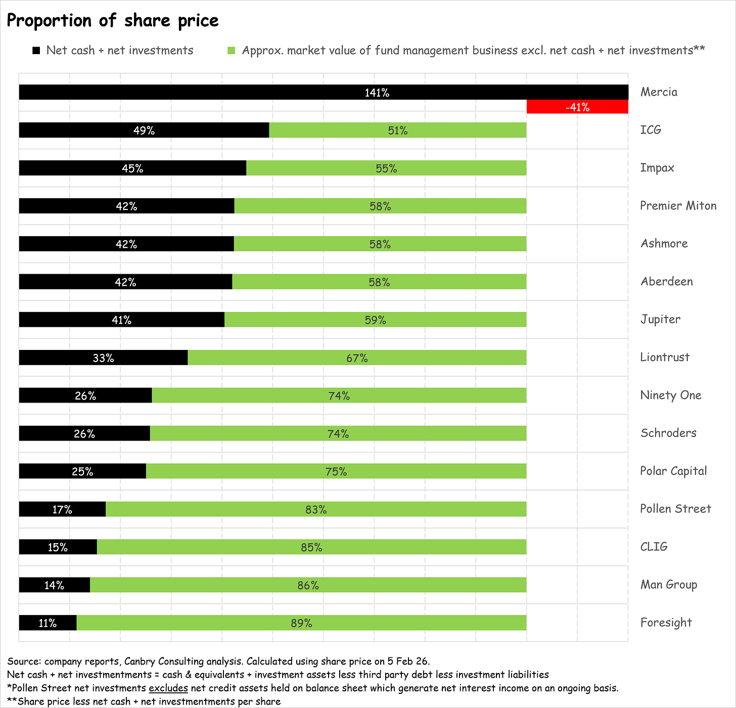 The difference between that balance sheet value and the share price are the green bars above (red in the case of Mercia – an extreme outlier – see further commentary below), which I’ve labelled as an approximate market value of fund management business. That’s anything but perfect because of course asset managers need some cash for regulatory compliance and to run their business and sometimes need to invest in their own funds to build clients’ confidence - you can’t totally isolate these balance sheet items. But it is useful to highlight the scale of some asset managers’ cash piles and investment portfolios.