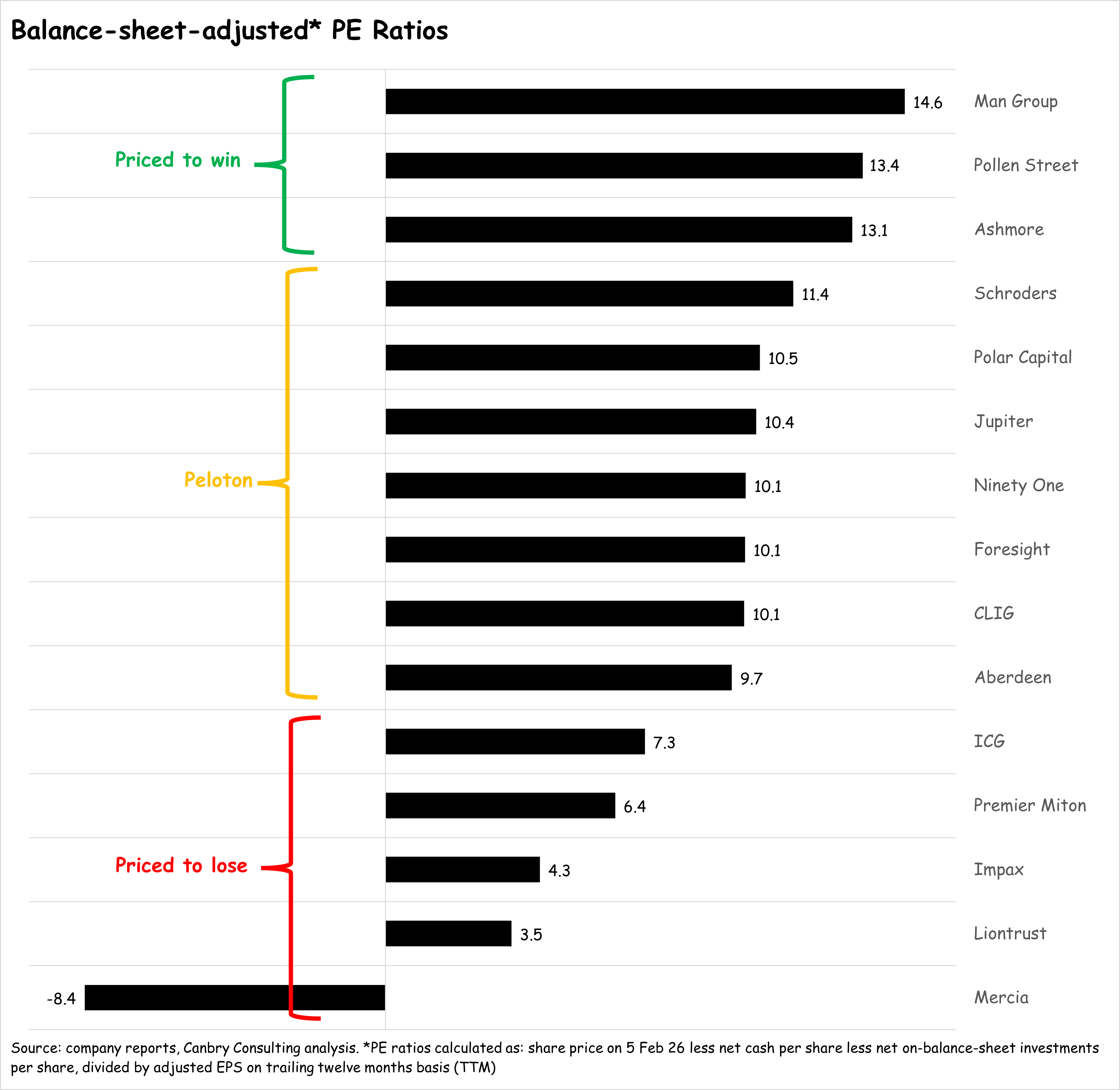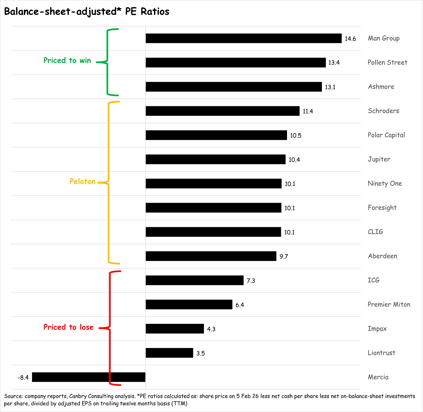 So for an even better relative comparison of asset managers’ valuations, we can strip out the value of the above balance sheet items from the share price, and create a ‘balance-sheet-adjusted PER’, which deducts the net cash and net investments per share from each company’s share price, and then divides that by adjusted earnings per share.