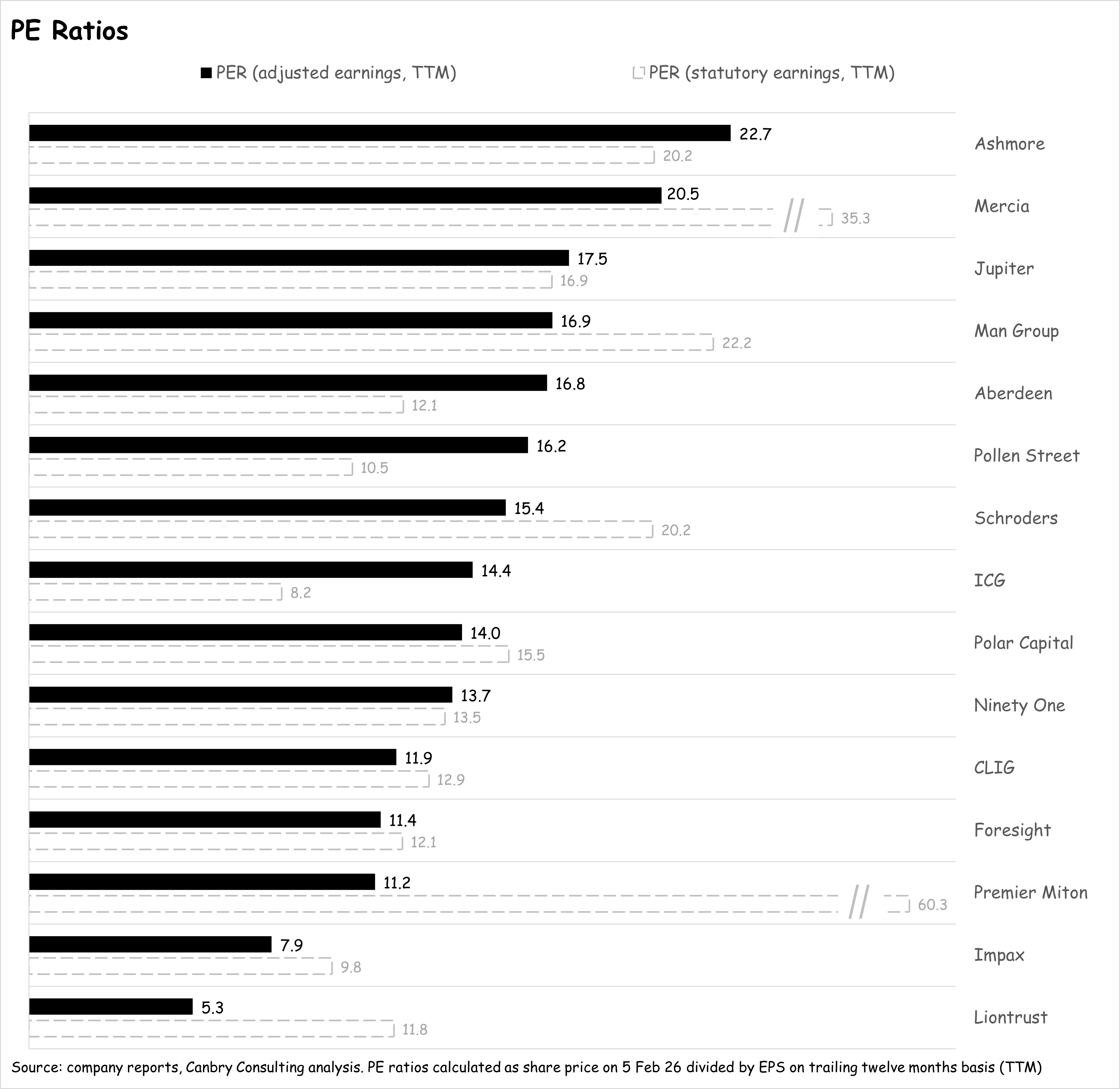 On a standalone basis, the absolute values of these PERs are not that useful (as part of these balance sheet items are necessary to generate earnings), but the relative value of these PERs between asset managers is extremely useful. It strips out a lot of the noise found in ‘normal’ PE Ratios and really does tease out which asset managers’ share prices are baking in earnings growth, or not.