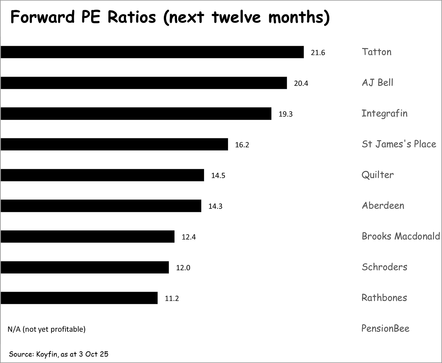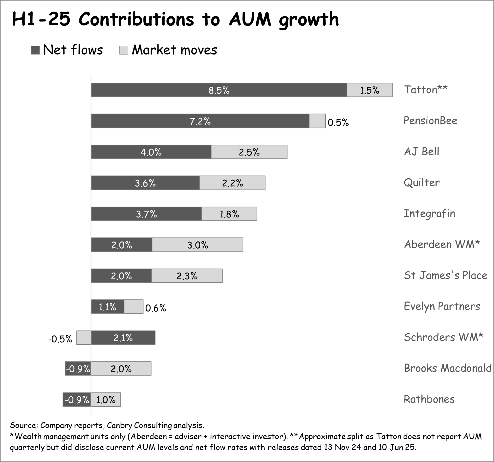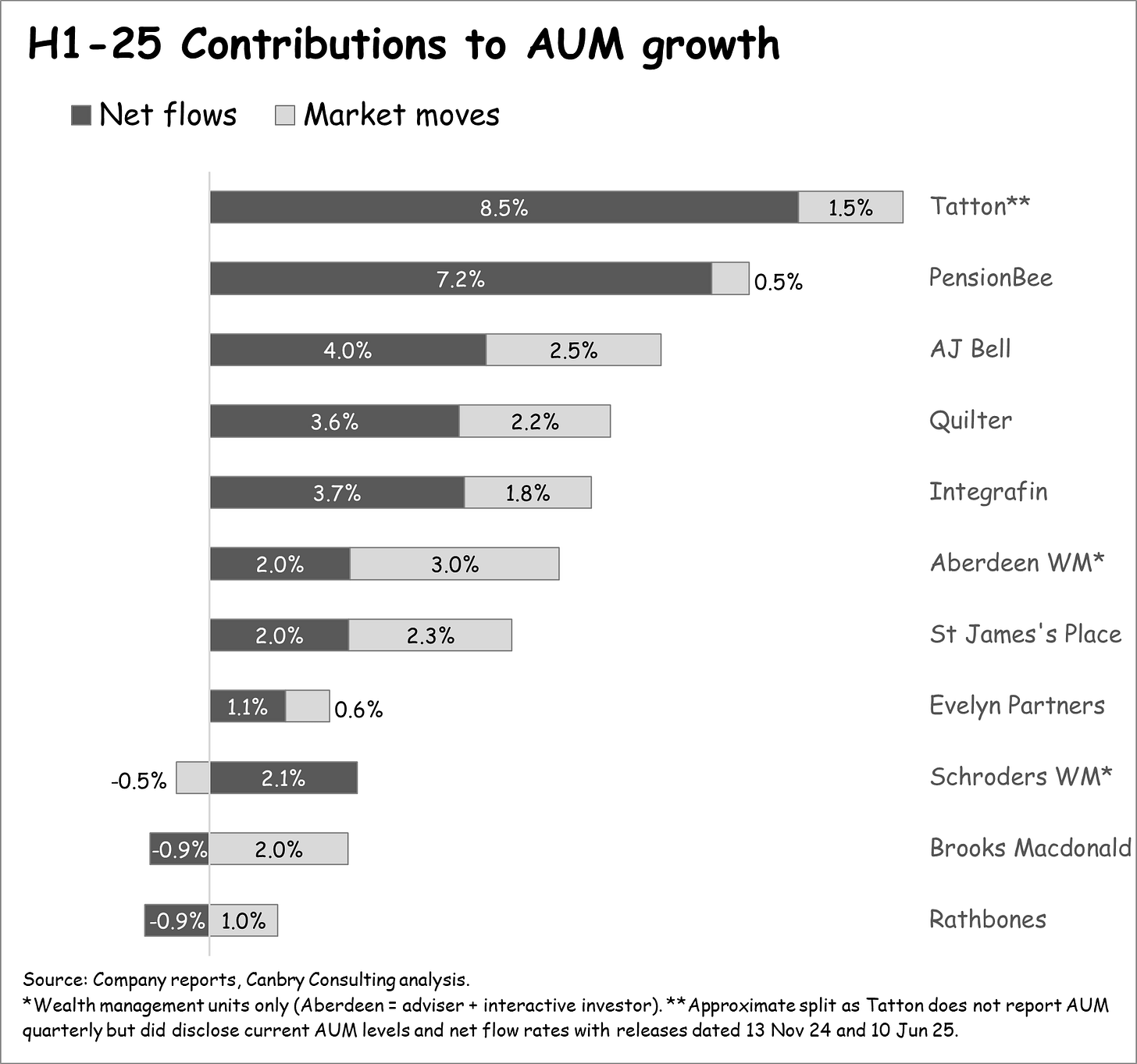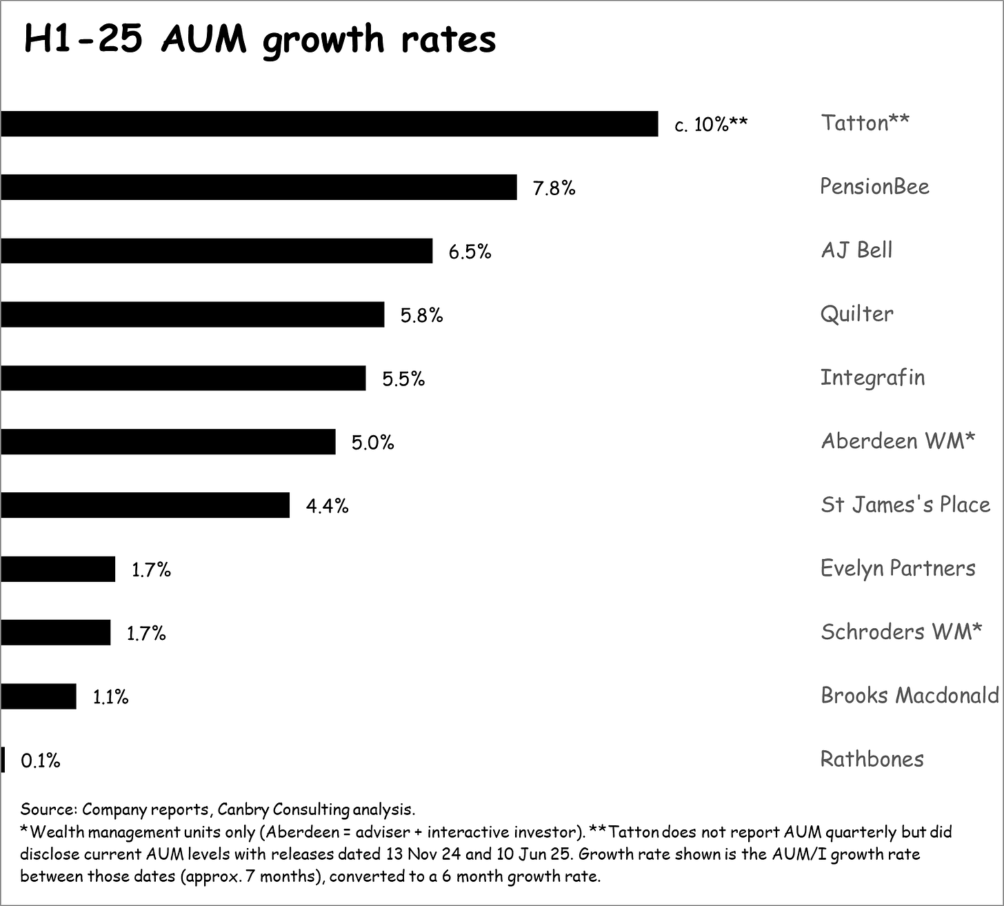 Growth was a mixed bag in H1. Tatton and PensionBee continued to be the growth leaders, with AUM up around 10% and 8% respectively. A mid-tier group recorded 4-7%. While growth was fairly anaemic for Evelyn, Schroders, Brooks Macdonald, and Rathbones.