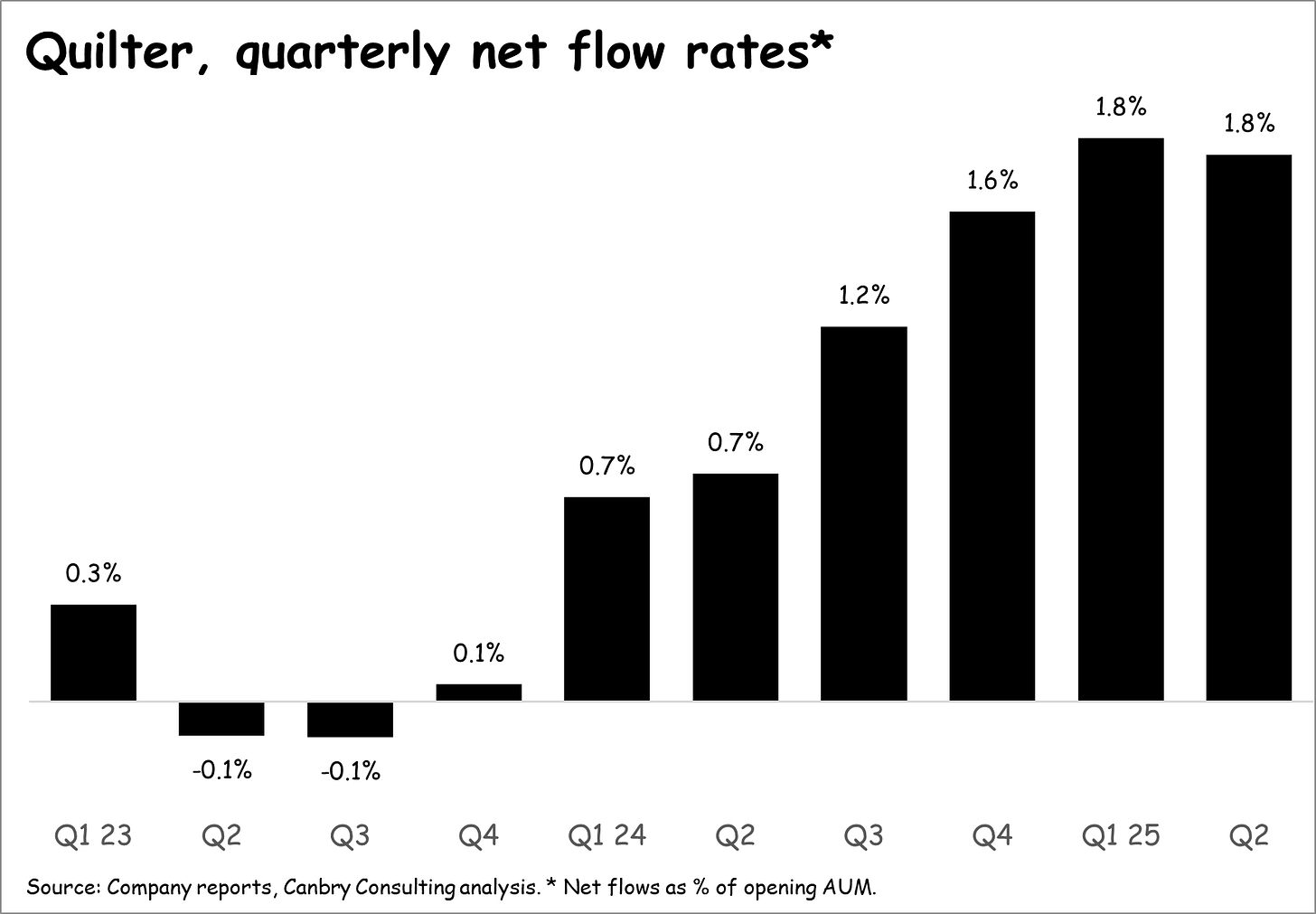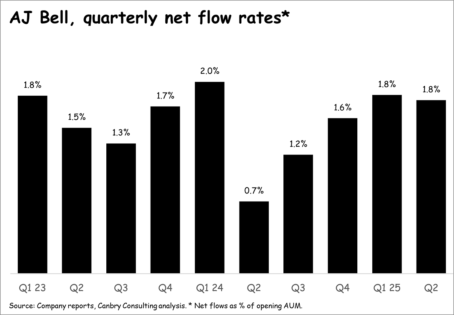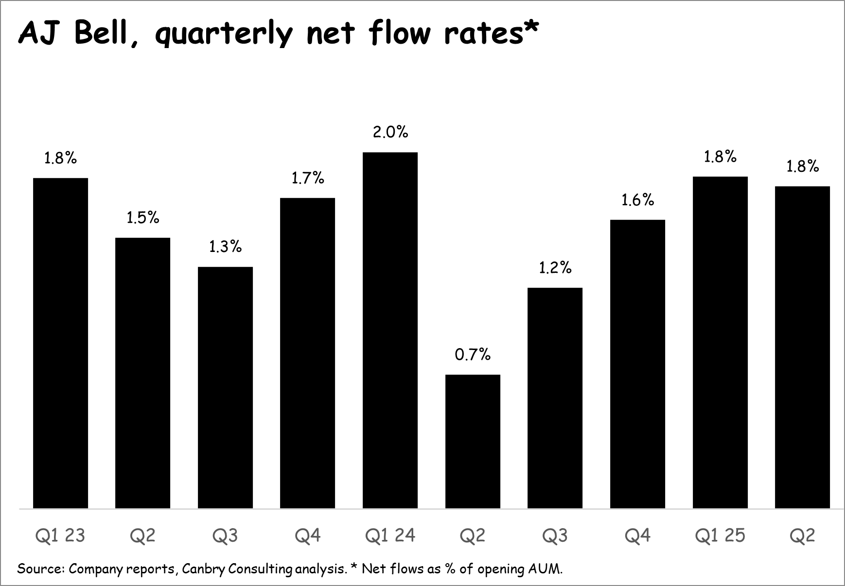 Key is a return to positive net flows after a tough period characterised by quite heavy outflows. It nearly got there in Q2 (see black bars below) so it will be hoping for a move into positive territory in Q3.