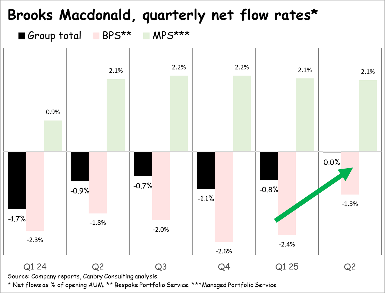 But especially important will be stopping the bleeding of its (previously?) flagship and higher-margin Bespoke Portfolio Service (BPS) product (around 44% of FUMA). It saw a welcome improvement in flows in Q2 (pink bars below).