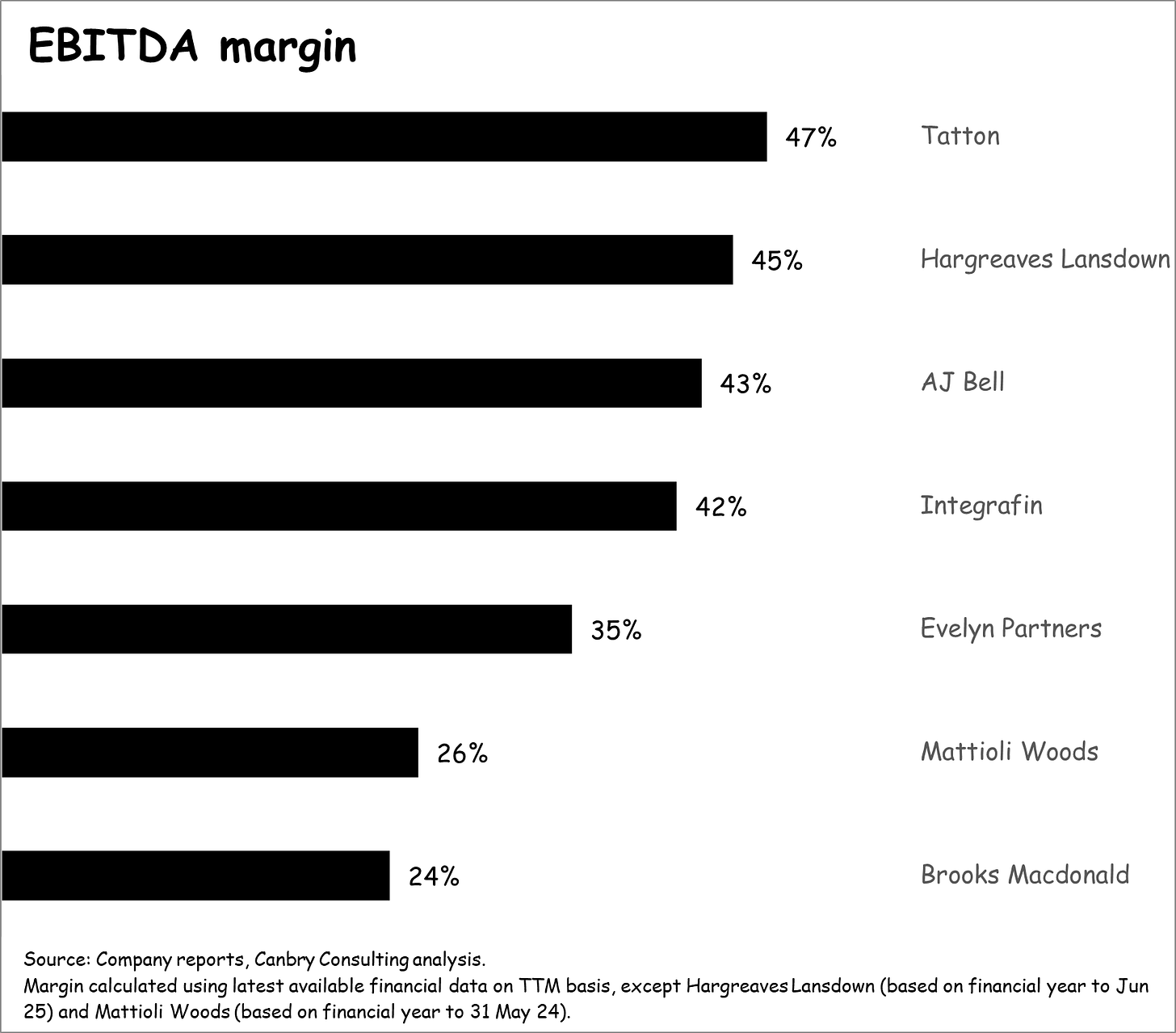 Note the above chart is missing a few comparators, notably St James’s Place (SJP), Quilter, and Rathbones, where Enterprise Value and EBITDA are metrics which don’t make a lot of sense for comparative purposes. This is because of their financial structures. SJP and Quilter house long-term insurance licenses (used to provide clients with certain types of investment bonds and pension-related insurance structures). And Rathbones is a bank (even though its core business is wealth management, it uses its banking license to provide clients with some wealth-management-adjacent deposit and loan services - not transactional banking services).