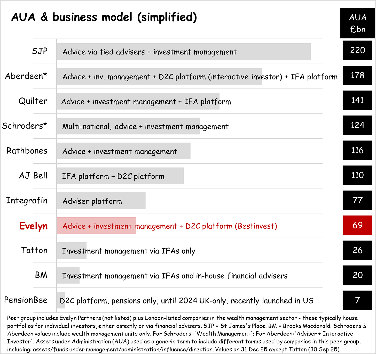 Evelyn has a broad wealth management offering including financial planning, discretionary investment management and a direct-to-consumer platform, BestInvest. It has approximately 270 financial planners and 325 investment managers (source: NatWest acquisition announcement). Here’s how it’s size and business model maps against London-listed wealth management peers. [AUA = assets under administration]