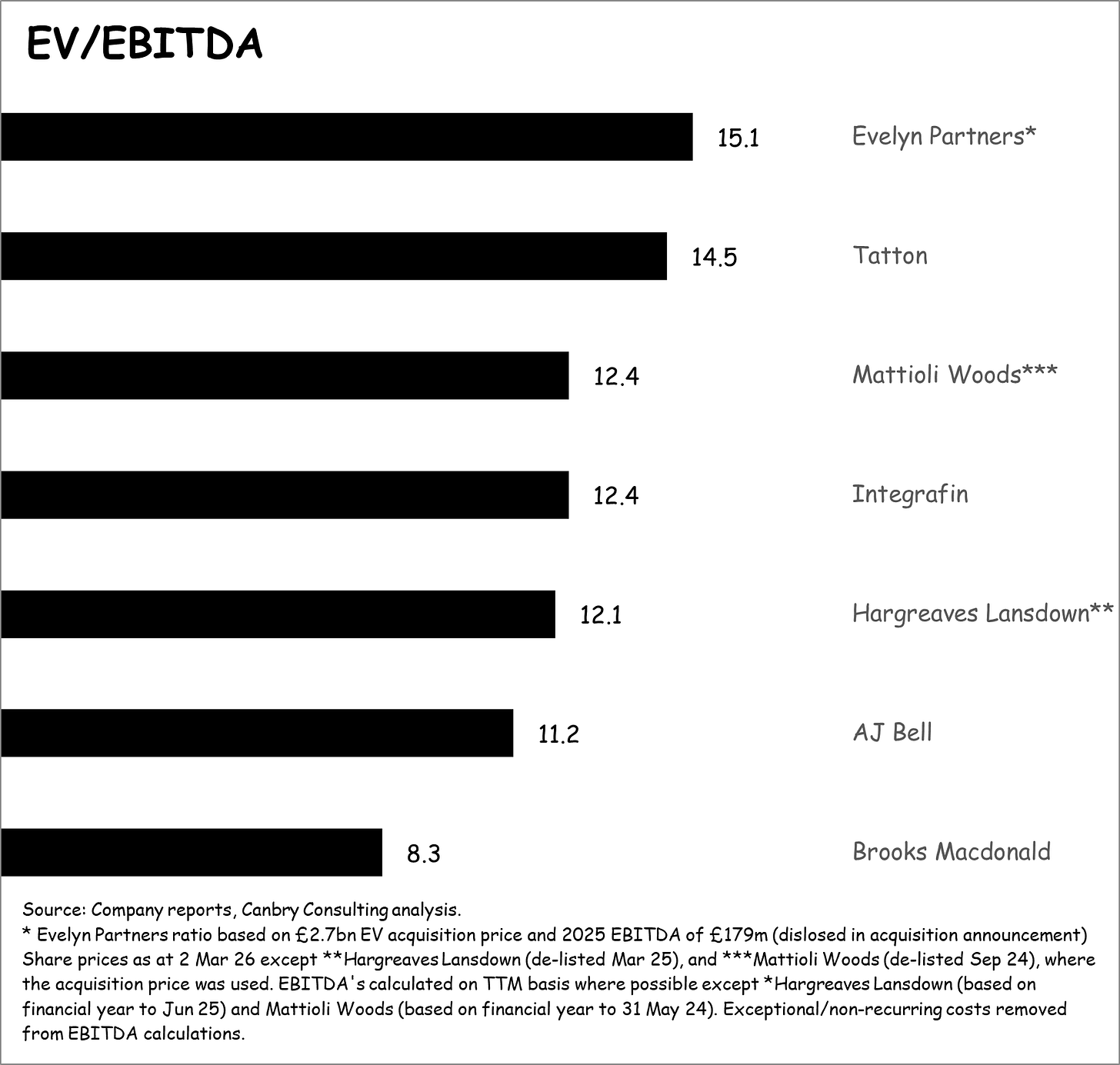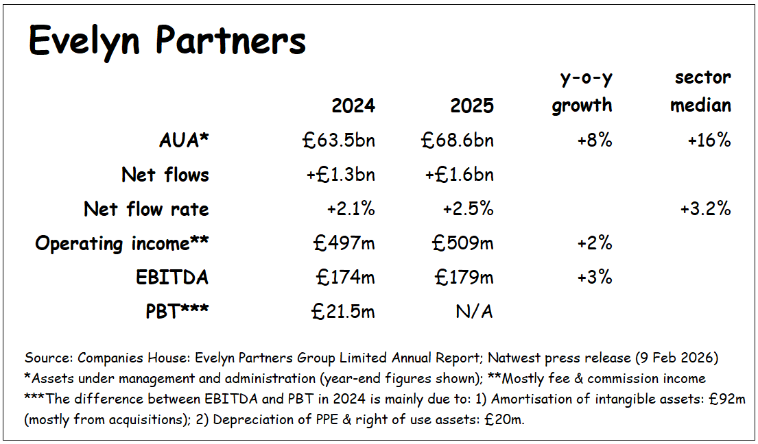 NatWest management were eager to emphasise that the price made sense to them: “Evelyn Partners generated full year 2025 EBITDA of £179m, meaning that the transaction values Evelyn Partners at the equivalent of 9.7x 2025 EV to EBITDA multiple, including target run-rate cost synergies” (my emphasis).