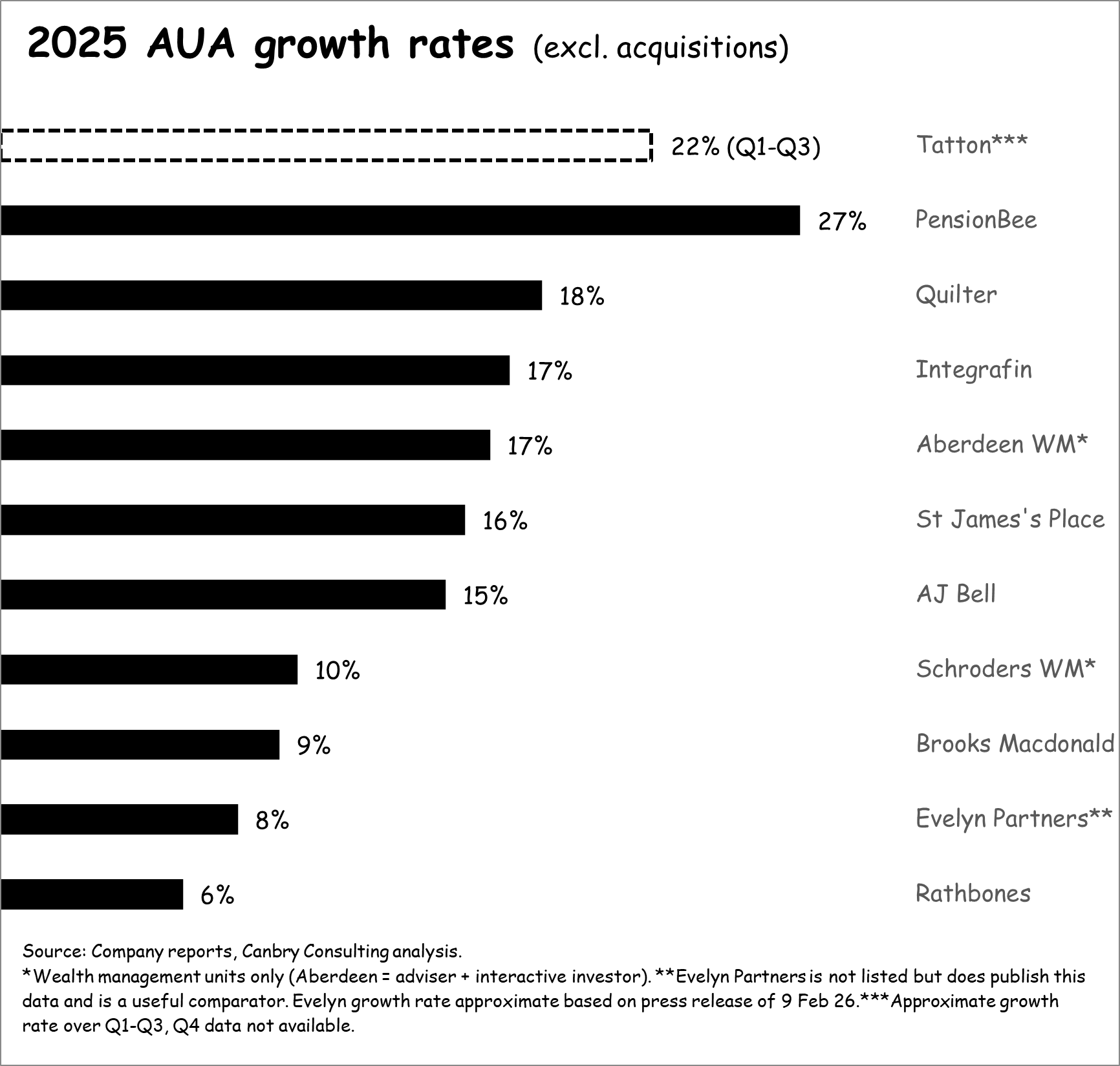 That acquisition multiple might not be a surprise at first glance, but when viewed through the lens of performance versus listed peers, it looks very punchy. While its valuation multiple is higher than peers, Evelyn had the second-weakest AUA growth in 2025…