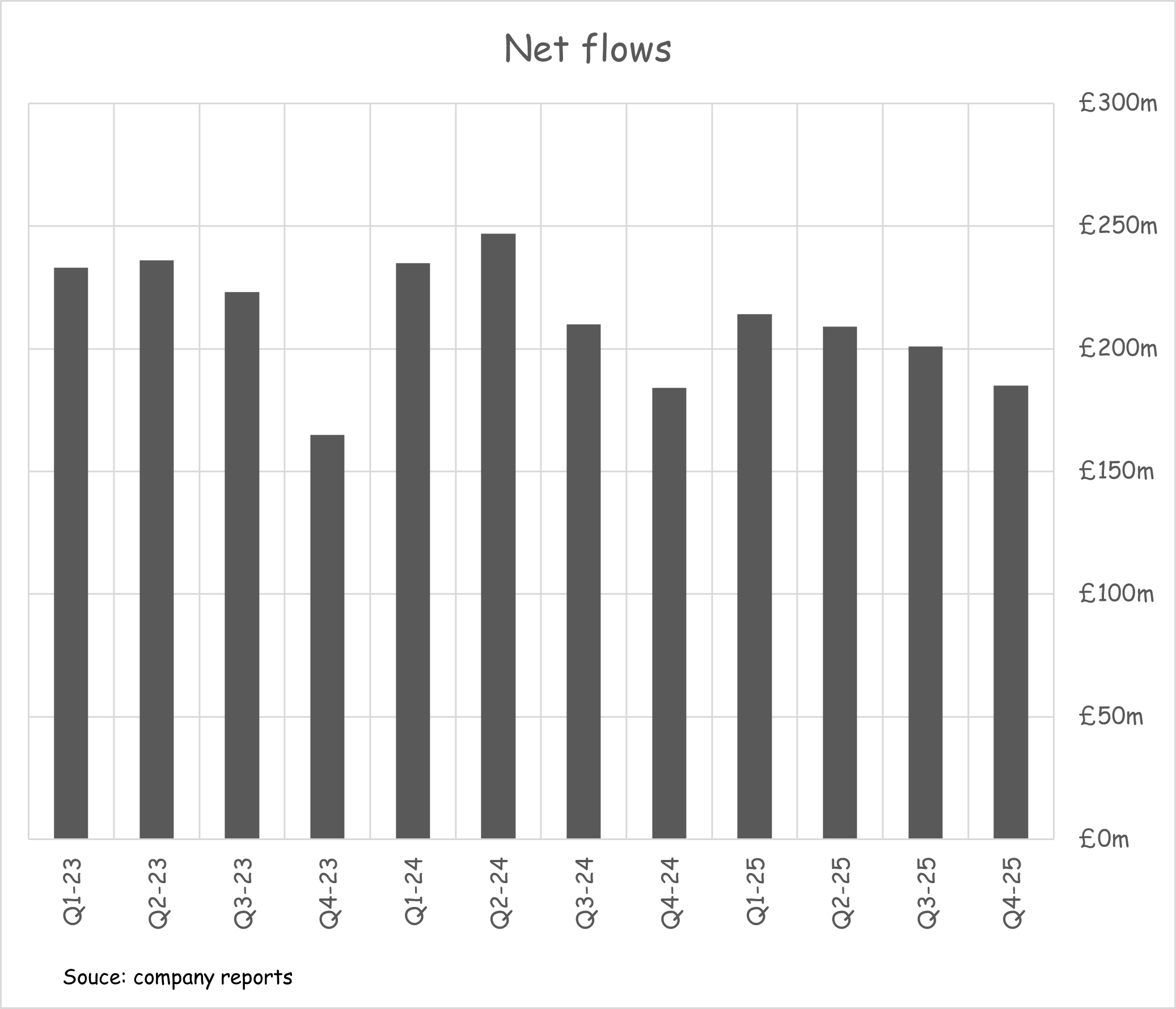 Net flows have been relatively consistent at around £200m per quarter, with some seasonality.