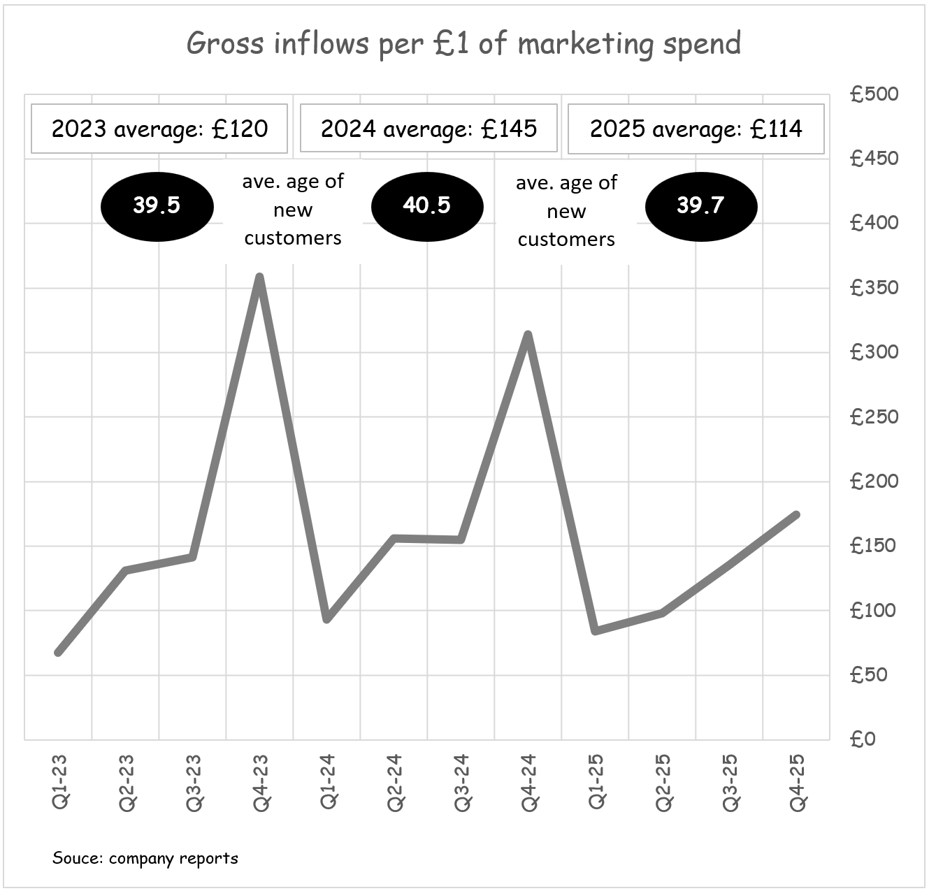 The company also attributes the fall in marketing spend efficiency to its strategy of targeting a slightly younger age cohort in 2025. The size of incoming pension pots are highly correlated to age (older cohorts bring larger pension pots).