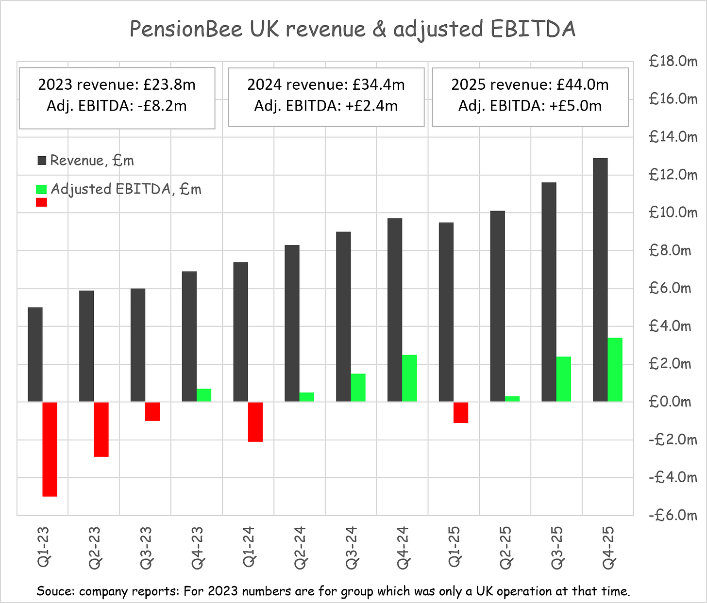 EBITDA has clearly moved into positive territory for the UK, with the business now able to reinvest profits. PensionBee UK doubled its EBITDA in 2025, despite a substantial ramp up in marketing spend from £9m to £12m.