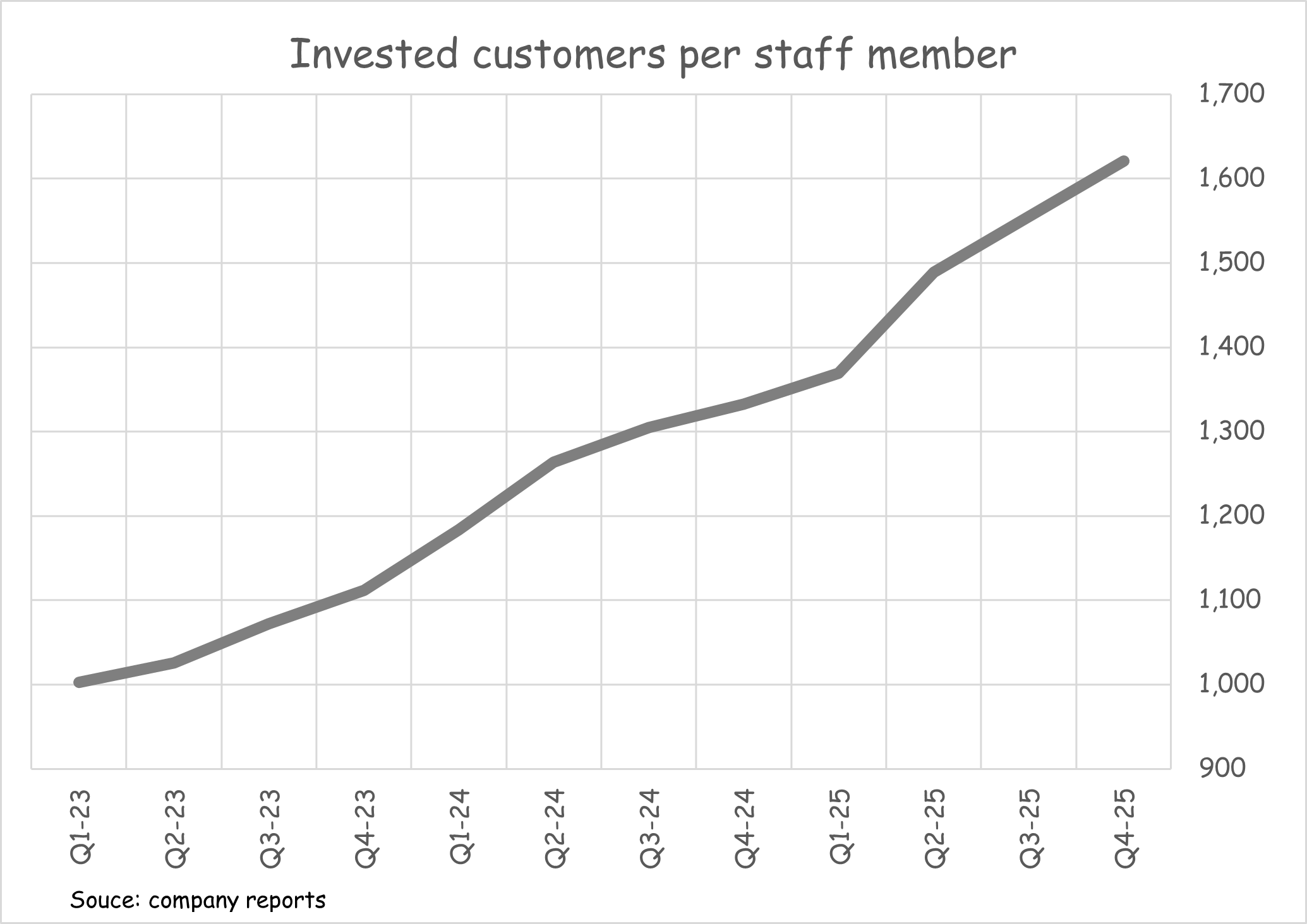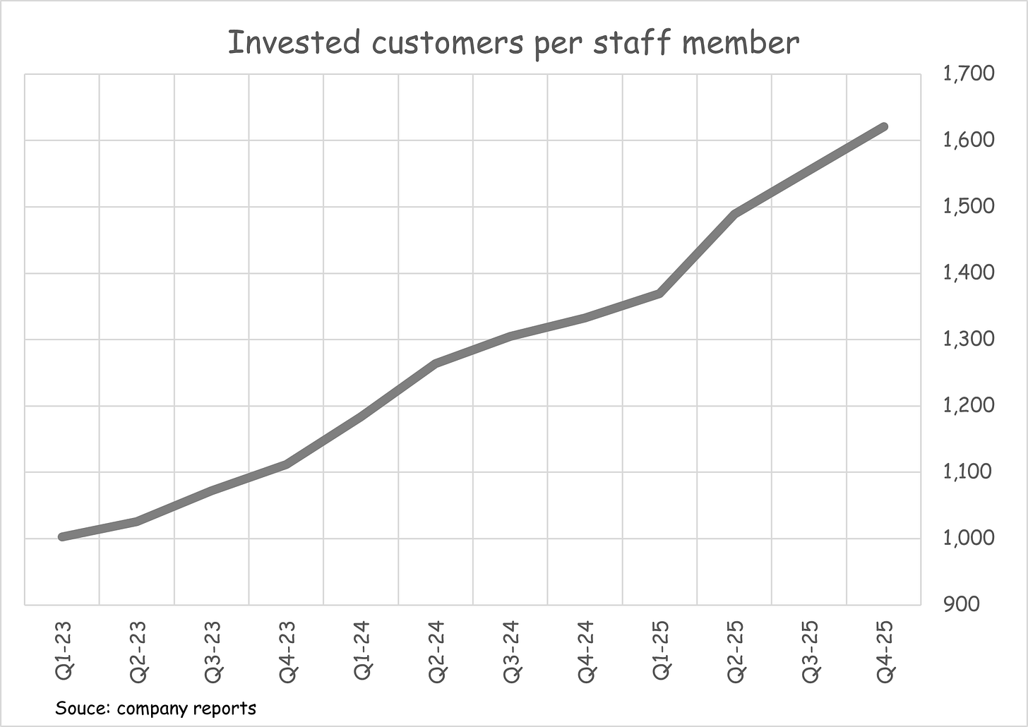 Offsetting the above headwind though has been a continuing increase in operating leverage. One of the cleaner measures of this is the number of invested customers per staff member - and this remains on a solid upwards trajectory as PensionBee scales.