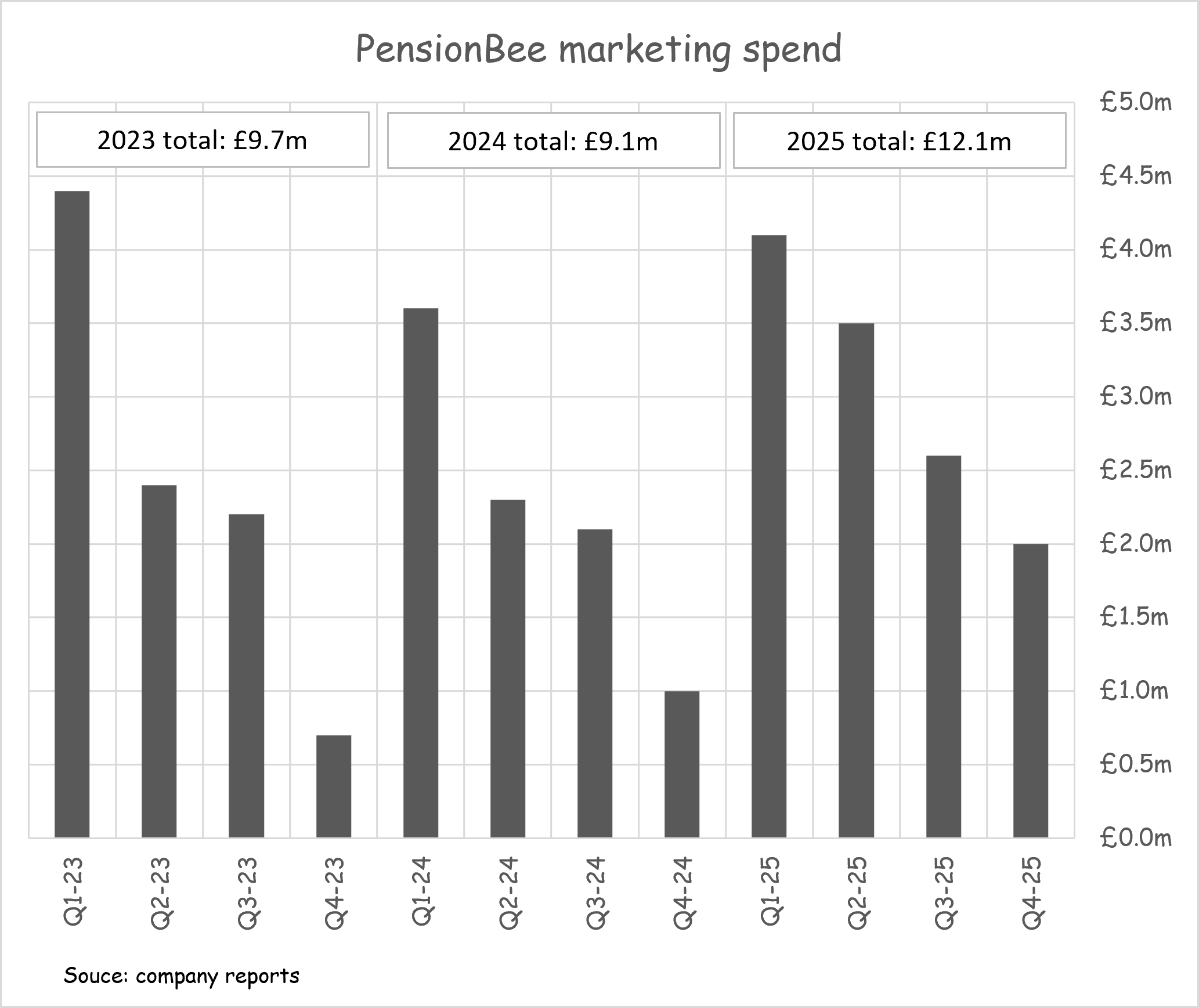 This can be seen in marketing spend efficiency. In 2025, PensionBee generated lower gross inflows per £ of marketing spend compared to prior years. In the chart below it is clear that the usual Q4 spike in gross inflows per £ of marketing spend was largely absent in 2025 (this metric usually spikes in Q4 as marketing spend in Q4 falls while gross inflows should still have some momentum from marketing spend in Q2 & Q3).