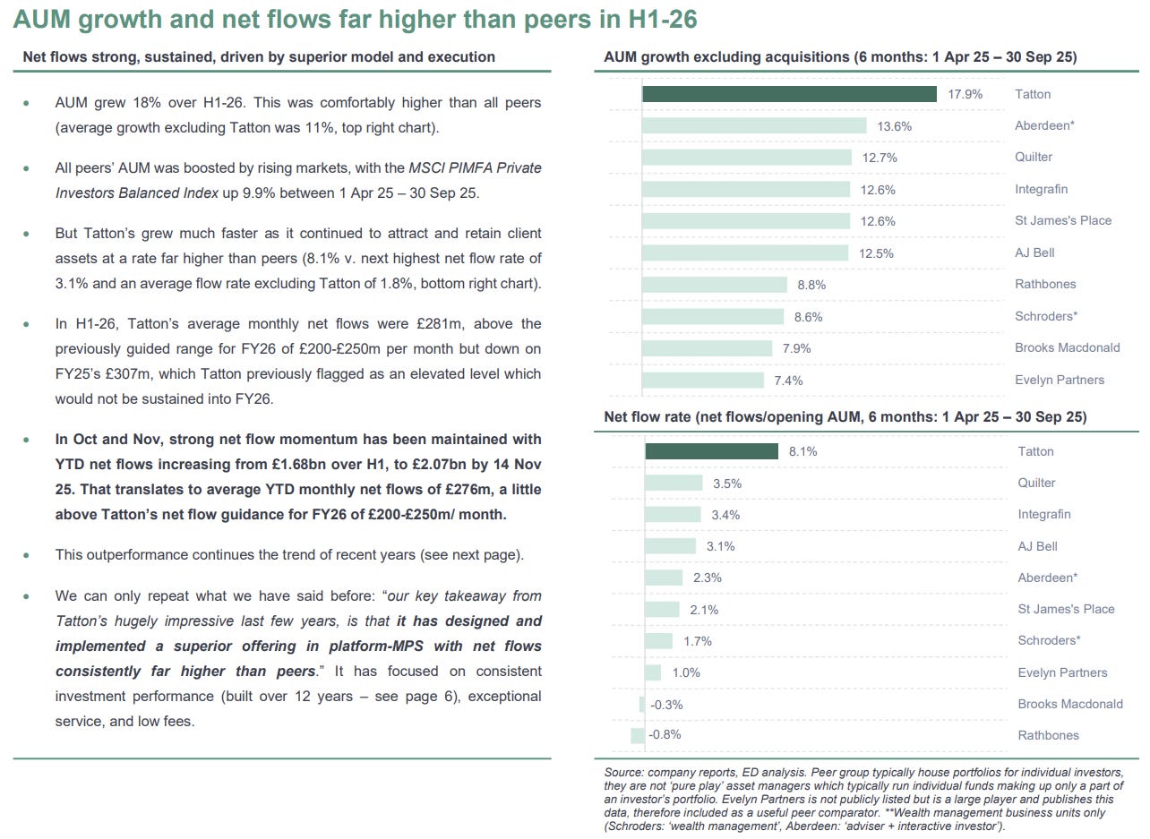 After its Oct 25 trading update, we knew Tatton had maintained its exceptional growth momentum; Assets-Under-Management/ Influence (AUI) were up 18% over H1-26, and net flows remained strong at £281m/ month, above Tatton’s guidance for FY26 of £200-£250m/ month. In the post-results period, AUI growth has continued, up another 5% to £27.1bn on 14 Nov 25. YTD net flows have increased from £1.68bn over H1 to £2.07bn.