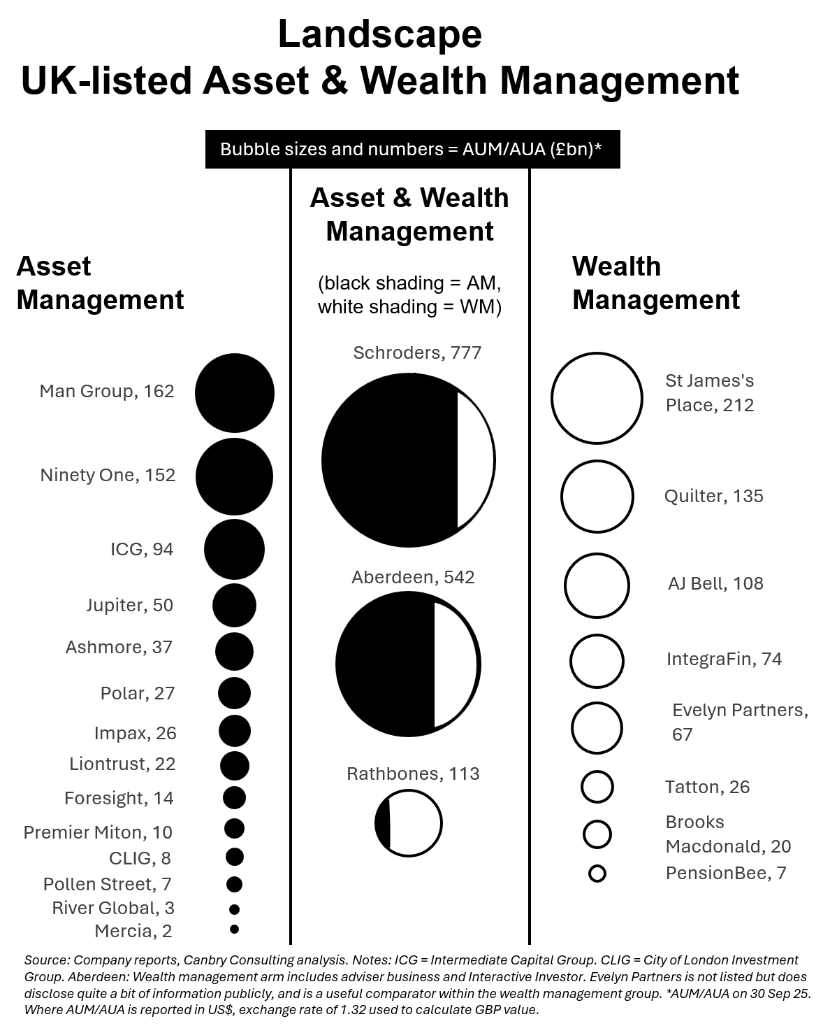 Schroders: Multinational asset manager with diverse offering serving a range of institutional and private investors. Public and private markets investment capabilities. It also has a significant advisory business (e.g. investment and advisory services to corporate pension schemes, insurance companies etc). Asset management AUM dominates (> 80% of AUM). It has a smaller but still significant wealth management arm (Cazenove Capital, Benchmark, Schroders Personal Wealth).